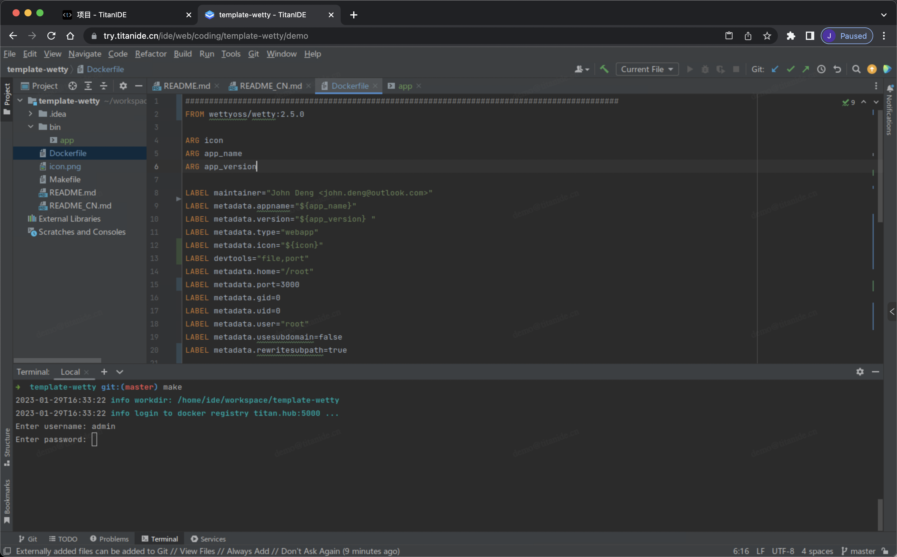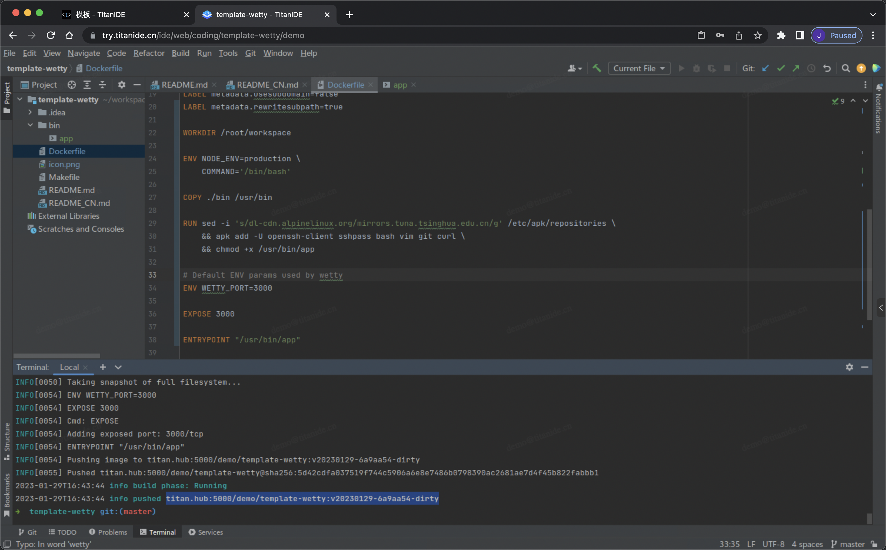 要在 TitanIDE 运行一个全新的 WeTTY, 首先需要构建一个模板镜像,然后通过模板镜像创建模板,再通过模板创建项目。当然以上是一次性操作,以后就可以直接通过创建好的模板创建项目即可。
