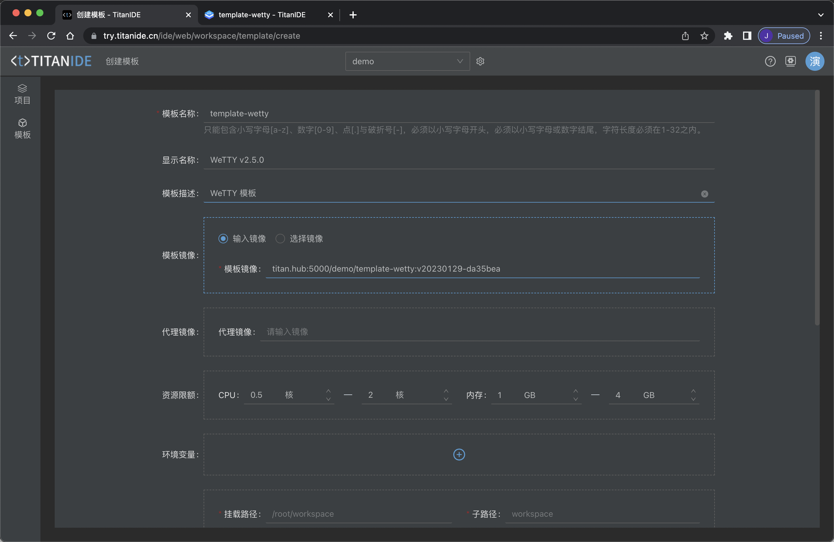 将之前复制好模板镜像 URL (例如:titan.hub:5000/demo/template-wetty:v20230129-da35bea)粘贴到模板镜像输入框,再指定模板名称,除了以上项必填之外,其它为选填项,您可以根据需要来填写,如显示名称,模板描述等。