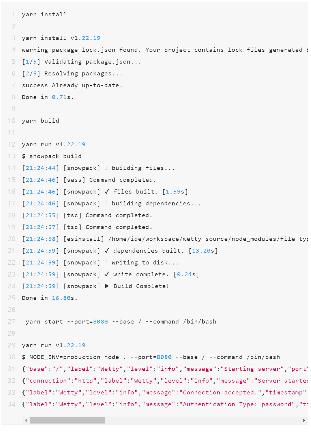 上图是我在 TitanIDE 创建了一个 VS Code 项目,克隆了 WeTTY 源码并运行起来了,指定了 --command 却不起作用,下面是完整的启动命令。